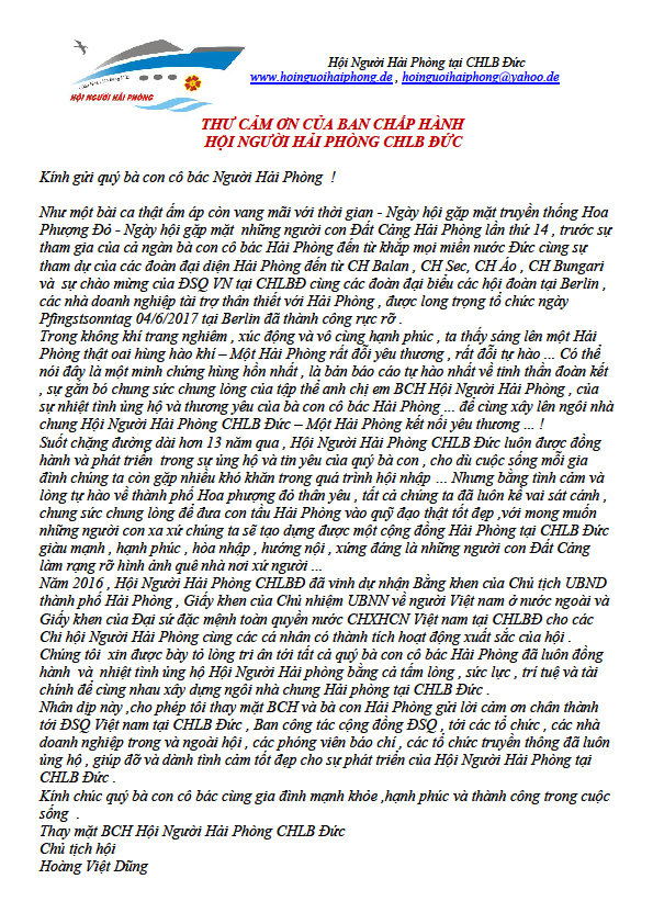 Thư cảm ơn của BCH Hội người Hải Phòng tại Đức