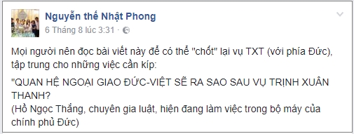*Bài viết „Quan hệ ngoại giao Đức-Việt sẽ ra sao sau vụ việc Trịnh Xuân Thanh?„còn được ông Nguyễn Thế Kỷ – Ủy viên Trung ương Đảng, Phó Trưởng Ban Tuyên giáo Trung ương, TGĐ Đài tiếng nói VN ( FB: Nguyen The Nhat Phong ) đăng trên trang cá nhân: https://www.facebook.com/theky.nguyenba/posts/750792445090869