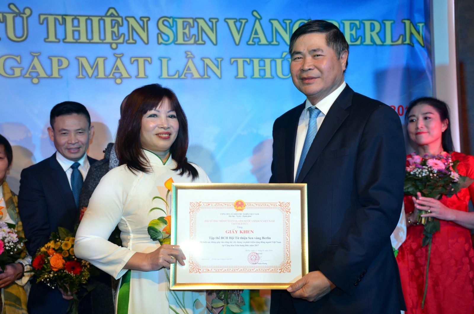 Nhân dịp này, Đại sứ Đoàn Xuân Hưng cũng trao tặng Giấy khen cho Ban chấp hành cũng như Giấy khen cho tập thể Hội từ thiện Sen Vàng Berlin vì những thành tích trong phong trào xây dựng cộng đồng và những hoạt động xã hội, từ thiện năm 2017.