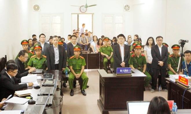 Ký giả Trương Minh Đức (đứng giữa) trong phiên tòa hôm nay ngày 05/04/2018