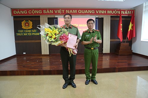 Thiếu tướng Nguyễn Dĩnh, Cục trưởng Cục Cảnh Sát Truy Nã Tội Phạm (C52) Bộ Công An tặng hoa lưu niệm cho Đại tá Lê Trọng Phúc